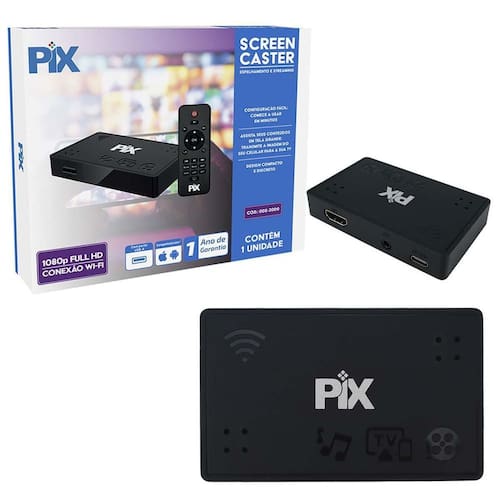 Screencaster Para Tv Com Espelhamento Streaming Via Hdmi Wifi Compatível com Windows 10 , MacOs, , Android ... Screen caster espelhamento e streaming Manual Em Português Desfrute da praticidade de transmitir seus conteúdos favoritos diretamente do seu Celular ou tablet para a tela da TV. Com o Screencaster da PIX você vê as suas fotos, Vídeos e aplicativos na tela da TV de forma prática e com qualidade superior. Compatível com sistema Android e IOS, funciona com a maioria dos dispositivos, Garantindo uma experiência de uso simples e intuitiva. PIX: Áudio, Vídeo e Você Especificações técnicas - WI-FI: 2.4ghz - Alimentação: DC 5V 500mA via cabo USB-C - Memória RAM: 128 Mb - Memória FLASH: 8 Mb - Alimentação do controle remoto: 2 pilhas AAA Não acompanha - Classificação Anatel: 08993-24-07516 Homologação Anatel: 112572013224 Marca: Não Informado