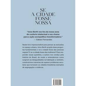 Joice Berth, uma das ativistas antirracistas de maior destaque no Brasil, lança seu primeiro livro sobre direito à cidade. Nos últimos anos, Joice Berth angariou posição importante na opinião pública com argumentos preciosos sobre os desafios que as lutas antirracista e feminista enfrentam para avançar em pautas fundamentais de igualdade social – seja nos costumes, no mercado de trabalho ou na política institucional. Suas colocações a tornaram referência nas redes, fazendo com que a arquiteta e urbanista de formação fosse rapidamente reconhecida como uma das influenciadoras mais requisitadas para analisar fatos e comportamentos que escancaram nossas questões sociais mais alarmantes. Em Se a cidade fosse nossa, Joice Berth se volta para o tema principal de seus estudos e preocupações: o direito à cidade. Neste livro, as disciplinas de arquitetura e urbanismo são singradas pela crítica racial e feminista. A autora, através de uma escrita propositiva e acessível, conta a história da formação das cidades brasileiras desde a colonização, para deixar evidente o quanto nossos projetos de urbanização, mesmo os mais recentes, carregam uma herança higienista que teima em se perpetuar. Dessa maneira, o pensamento e os projetos de arquitetos e urbanistas de renome, como Lúcio Costa, Lina Bo Bardi e Diébédo Francis Kéré, são pareados às referências de Angela Davis, bell hooks, Patricia Hill Collins, Paulo Freire e Milton Santos. Após a leitura deste Se a cidade fosse nossa, dificilmente o espaço urbano continuará sendo visto como modelo uniforme que distancia centro e periferia, ricos e pobres, brancos e negros, homens e mulheres. Aqui, Joice Berth propõe alternativas aos municípios brasileiros do século 21, para que possam se transformar em espaços de sinergia de saberes, congregação dos diversos modos de vida e de oportunidade de uma existência melhor para todos, sem distinção de gênero, raça, classe e orientação sexual.