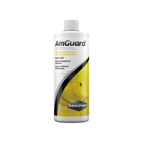 O Seachem AmGuard é uma fórmula rápida, segura e eficiente de remover a amônia livre do aquário. O AmGuard reage com a amônia livre em poucos minutos e não altera o pH.Seachem AmGuard remove, também, cloro e cloramina.O Seachem AmGuard é o removedor de amônia líquido mais concentrado do mercado, age em poucos minutos na desintoxicação da amônia e esse resultado não se desfaz por quase o dobro do tempo apresentado em outros produtos.A amônia pode se apresentar de duas maneiras: em sua forma livre ou ionizada, porém, apenas a forma livre é tóxica.Amguard é o removedor de amônia mais forte no mercado. Ele funciona dentro de minutos para desintoxicar amônia livre, e não se degrada por quase 48 horas. Isso é quase o dobro do tempo que os produtos de nossos concorrentes.Utilização 1 tampinha 5 ml para cada 200 L 50 galões por dia ou conforme necessário, para reduzir o amoníaco.