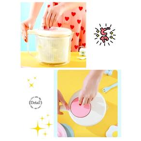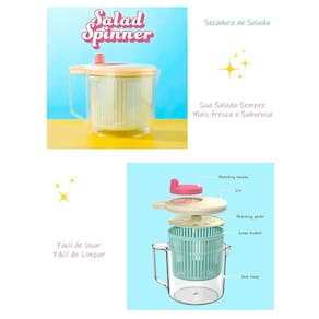 Esta secadora de salada é fácil de usar e foi projetada para secar saladas e vegetais em segundos, garantindo que suas folhas estejam prontas para consumo ou armazenamento de forma rápida e conveniente. Além disso, sua eficácia na remoção do excesso de água dos vegetais contribui para prolongar sua durabilidade na geladeira.