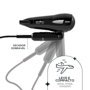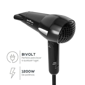 Bivolt manual Potência de 1200W Íon Tourmaline APELO BENEFÍCIO Bivolt manual Perfeita para levar a qualquer lugar Íon Tourmaline Cabelos mais macios e brilhosos graças aos íons que fecham as cutículas dos fios e reduzem o frizz, por neutralizarem a eletricidade estática natural dos cabelos. Bocal concentrador Sua saída fina concentra e direciona o calor, facilitando a secagem e modelagem dos fios Cabo dobrável Facilidade de armazenamento e praticidade para levar em viagens 2 temperaturas e 2 velocidades Variedade de temperaturas e velocidades para diferentes tipos de cabelo. Cordão de 1,8m Maior liberdade de movimento