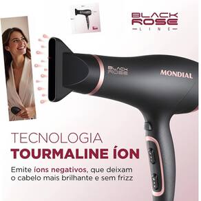 - **Nome do produto:** Secador de Cabelos Mondial SC-37 Black Rose- **Voltagem:** 110V ou 220V (não bivolt)- **Potência:** 2000W- **Tecnologia:** Tourmaline Íon- **Temperaturas:** 3 opções- **Velocidades:** 2 opções- **Material da grade:** Cerâmica- **Dimensões:** 9 x 22,5 x 29 cm- **Peso:** 540 g- **Marca:** Mondial- **Modelo:** SC-37- **Certificação:** BRA 18/01618- **EAN:** 7899882306989, 7898578152695