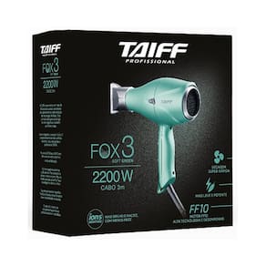 Secador de Cabelo Taiff Fox Ion 3 Soft Green Profissional 2200w Leve e Potente íons Negativos 220v Leve elegante, o secador Fox íon 3 proporciona muito mais conforto durante o uso, sem perder a potência de 2200W. As cores Soft Rose e Soft Green dão a ele um estilo próprio e muita sofisticação.