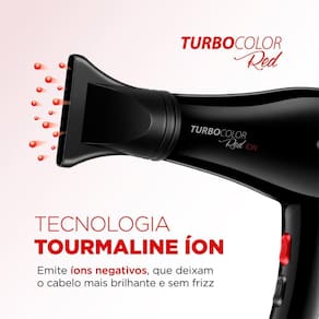 O destaque desse secador é a tecnologia Turbo Color Red, que possui um revestimento com tourmaline íon, um mineral que emite íons negativos. Esses íons ajudam a reduzir o frizz e deixam seu cabelo macio e brilhante, proporcionando um resultado de salão de beleza no conforto da sua casa.