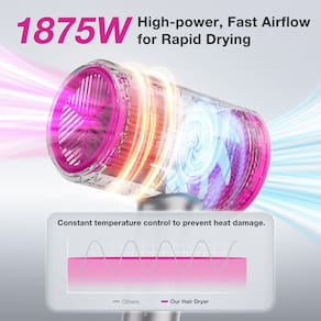 - [Secagem mais rápida de 1875 W] Um potente motor de 1875 W e um design aerodinâmico de fluxo de ar reduzem o tempo de secagem pela metade. Ele pode fornecer secagem e modelagem rápidas sem esforço, tornando cada sessão de modelagem uma experiência luxuosa