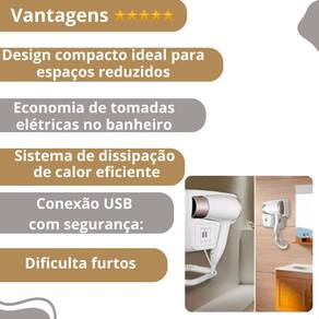 Secador de cabelo compacto quente e frio branco 110v Descrição do anúncio: Adicione sofisticação ao seu banheiro com o secador de cabelo de parede, perfeito para uso em casa ou em ambientes como hotéis, pousadas e spas. Compacto, leve e poderoso, este secador iônico cuida da saúde do seu cabelo, proporcionando um brilho e suavidade excepcionais. Com seu design resistente e funcionalidade avançada, ele é ideal para qualquer tipo de cabelo, seja liso, encaracolado ou ondulado. Conteúdo da embalagem: 1 secador de cabelo de parede 1 cabo espiral de poliuretano extensível até 1,6 metros Manual de instruções Características: Design compacto: fácil de armazenar e ideal para viagens. Funcionalidade iônica: reduz o tempo de secagem e elimina o frizz, proporcionando brilho e suavidade ao cabelo. Resistência: feito para suportar quedas, compressão e altas temperaturas. Ventilação poderosa: baixo nível de ruído e excelente dissipação de calor. Especificações: Potência: 1300w Frequência: 50hz Comprimento do cabo de energia: 70cm Comprimento do cabo do secador: até 1,20m cabo espiral Configurações: 2 ajustes ar frio e quente Material: plástico resistente Cor: branco Dimensões: 24 x 17,5 x 17cm 2x entradas usb Principais perguntas sobre o produto e respostas: 1 este secador é adequado para uso doméstico Sim, ele é ideal tanto para uso doméstico quanto para ambientes comerciais como hotéis e spas. 2 o cabo do secador é resistente Sim, o cabo espiral de poliuretano é altamente resistente, com boa extensibilidade e rápida retração. 3 posso usar este secador em uma tomada comum Sim, ele é compatível com tomadas de 10a. 4 o secador é barulhento Não, ele possui uma ventilação poderosa com baixo nível de ruído. 5 este secador pode ser em cabelos molhados Sim, ele é projetado para secar rapidamente cabelos molhados, mantendo a umidade natural e evitando danos. Marca: Não Informado Ean: 7905276300119