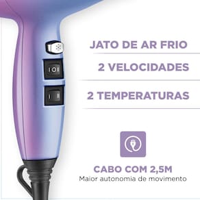 Características: Potência: 2000W Bocal Direcionador Bocal Difusor 2 Velocidade + 2 Temperatura Cabo de 2,5 Metros Motor Profissional AC: Jato de ar frio Itens inclusos: 01 Secador de Cabelos; 01 Bocal Difusor; 01 Bocal Direcionador e 01 Manual de Instruções Grade traseira removível Controle de temperatura