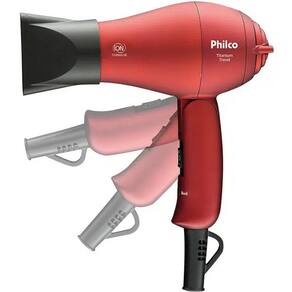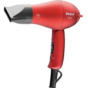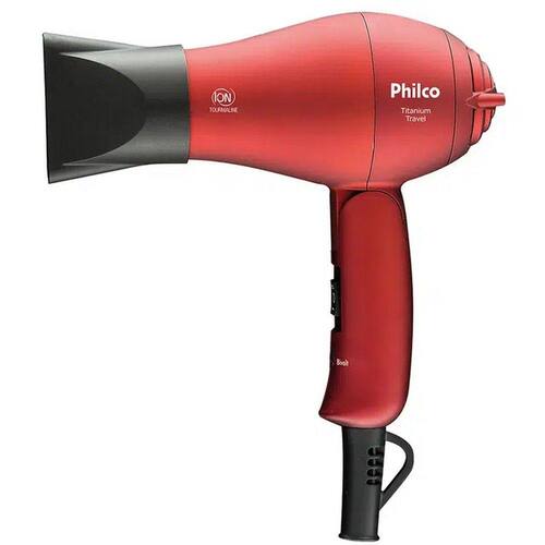 Características: Marca: Philco Modelo: Titanium Travel Tipo: Secador de cabelo Velocidades: 2 velocidades Tecnologia: Titanium tourmaline Botões: Liga/desliga Emissão de íons: Sim Difusor: Não Jato de ar frio: Não Comprimento do fio: 1,9 metros Grade de entrada de ar removível: Sim Filtro removível: Não Bico direcionador de ar: Sim Argola para pendurar: Sim Potência: 110V: 1000W | 220V: 750W