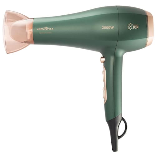 Seque seus cabelos com maior praticidade e em menos tempo com o Secador de Cabelos Britânia Ele conta com diferentes funções e acessórios que atendem as mais variadas necessidades para secar e modelar o seu cabelo. Seu design em verde e dourado traz maior charme na hora de secar os cabelos.