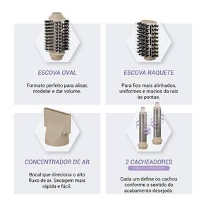 4 em 1: Acompanha concentrador de ar, cacheadores, escova oval e escova raquete.