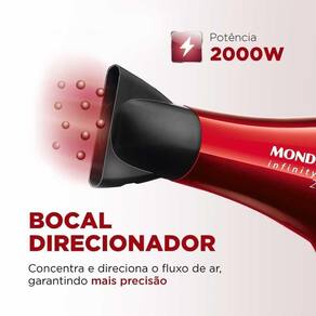 Secador de cabelos mondial infinity ion 2000w sc-12 220v seu cabelo lindo e saudável em pouquíssimo tempo conheça o infinity íon 2500 sc-12 da mondial, que tem 2000w de potência e proporciona mais agilidade na secagem dos fios. Além de economizar tempo, você ainda garante um aspecto saudável às mechas, com maciez e sem frizz, graças à tecnologia tourmaline íon. Com o calor, o mineral emite íons negativos que fecham as cutículas dos fios e reduzem o frizz. Seu cabelo fica mais brilhante e macio características:ean: 7898578152947marca: mondialmodelo: sc-12cor: vermelhovoltagem: 220vpotência: 2000wtourmaline ion: essa tecnologia faz com que as cutículas dos fios se fechem e o frizz dos cabelos se neutralizem, começando o processo de rejuvenescimento2 velocidades e 3 temperaturas: melhor desempenho para secar, alisar e modelarbocal concentradorjato de ar frio: acabamento perfeito e duradouro do penteadoalça para pendurar: maior facilidade na hora de guardar dimensões da embalagem:altura: 29cmlargura: 24cmprofundidade: 16cmpeso: 0,650kggarantia: 12 meses