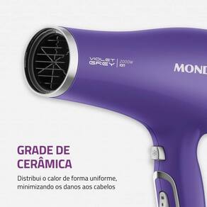 GRADE DE CERÂMICA: A grade frontal, por onde sai o ar, tem revestimento cerâmico e distribui o calor de forma uniforme, minimizando os danos aos cabelos.