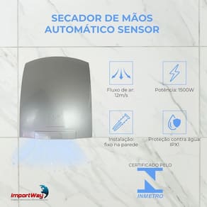 Secador De Mãos Automático Sensor 12M/S 1500W, os secadores de mãos automáticos são dispositivos práticos e higiênicos utilizados para secar as mãos rapidamente em banheiros públicos ou privados. Eles servem para: eficiência energética, higiene, sustentabilidade, conveniência. Além disso, são considerados uma opção mais econômica a longo prazo, pois eliminam a necessidade constante de reabastecimento de papel e manutenção relacionada.