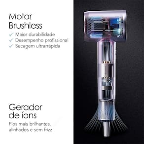 Vem com bocal concentrador, difusor e suporte de parede, todos com encaixe magnético para mais praticidade, segurança e agilidade no uso. O motor Brushless com 110.000 rpm oferece fluxo de ar intenso e seca mais rápido, com menos calor nos fios.