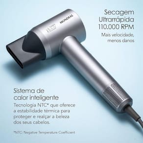 E para deixar os fios saudáveis, macios e sedosos, o Secador de Cabelos Mondial tem gerador de íons negativos, que reduz o frizz e aumenta o brilho dos cabelos, e conta com a tecnologia NTC para regular automaticamente a temperatura, proporcionando uma secagem segura e eficiente.