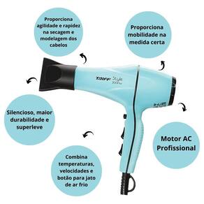 O secador Taiff Style é ideal para uso pessoal. Com potência de 2000W, proporciona agilidade e rapidez na secagem e modelagem dos cabelos. Possui motor AC Profissional, silencioso, maior durabilidade e é superleve. A chave seletora combina temperaturas, velocidades e botão para jato de ar frio, oferecendo 5 temperaturas diferentes. Tem design arrojado, novo bico direcionador de ar e cabo de 1,80 metro de comprimento, que proporciona mobilidade na medida certa.