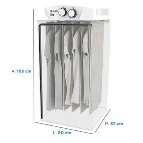 Por dentro, a secadora impressiona. Sua câmara de secagem em PVC garante uma distribuição uniforme das roupas, contribuindo para uma secagem mais rápida e eficiente. Com 6 varões e 5 cabides, as peças ficam bem posicionadas, evitando frisos, marcas e amassados indesejáveis, é quase como estender no varal, só que muito mais rápido.