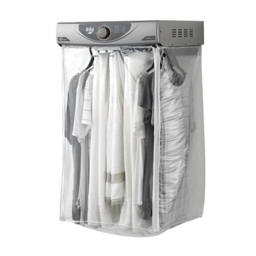 Características: Função: secar Temperatura máxima de 65ºC no interior do bag câmera de secagem Timer com ciclo máximo de 120min 2h , sendo15 minutos com ar frio ciclo amaciante e ciclo contínuo Bag em PVC cristal Fechamento por zíper Frontal em termoplástico com indicações dos tempos de secagem Corpo externo em aço pintado 3 varais fixos 6 cabides removíveis