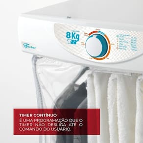 O painel intuitivo exibe claramente todos os tempos de secagem, garantindo facilidade no uso. Tenha controle total com o timer programável, que permite até 120 minutos ou uma opção contínua para uma secagem personalizada que deixa suas roupas sempre no ponto certo.