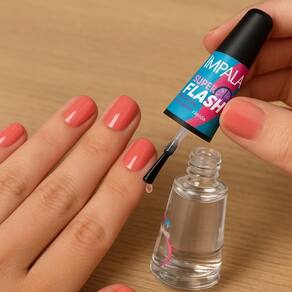 Após aplicar o esmalte, aguarde alguns segundos e aplique uma camada do Secante Impala Super Flash Silicone sobre as unhas.