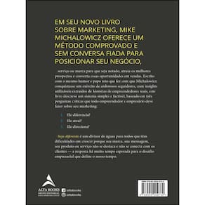 Em seu novo livro sobre marketing, Mike Michalowicz oferece um método comprovado e sem conversa fiada para posicionar seu negócio, serviço ou marca para que seja notado, atraia os melhores prospectos e converta essas oportunidades em vendas. Escrito com o mesmo humor e papo reto que fez com que Michalowicz conquistasse um exército de ardorosos seguidores, com insights utilizáveis extraídos de histórias de empreendedores reais, este livro descreve um sistema simples e factível, baseado em três perguntas críticas que todo empreendedor e empresário deve fazer sobre seu marketing: Ele diferencia? Ele atrai? Ele direciona? Seja diferente é um divisor de águas para todos que têm dificuldades em crescer porque sua marca, sua mensagem, seu produto ou serviço não se destaca e não se conecta com os clientes — a resposta há muito tempo esperada para o desafio empresarial que define o nosso tempo.