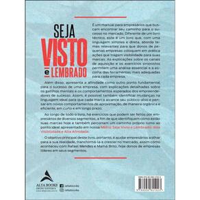 Seja Visto e Lembrado é um manual para empresários que buscam encontrar seu caminho para o sucesso no mercado. Diferente de um livro técnico, este é um livro que, com uma linguagem simples e direta, aborda temas relevantes para que donos de pequenas empresas coloquem em prática ações que tragam visibilidade para suas marcas. As explicações sobre os canais de aquisição e os exercícios propostos permitem uma análise essencial e a escolha das ferramentas mais adequadas para cada empresa. Além disso, apresenta a afinidade como outro ponto fundamental para o sucesso de uma empresa, com explicações detalhadas sobre os gatilhos mentais e os comportamentos esperados dos empreendedores de sucesso. Assim, é possível também identificar mudanças na linguagem ideal para que cada marca alcance seu público-alvo e pensar em novos comportamentos de aproximação, de maneira orgânica e eficiente, em curto e em longo prazo. Ao longo de todo o livro, há exercícios que podem ser feitos por empresários de diversos segmentos, a fim de que identifiquem como estão suas marcas hoje e também percorram um caminho próprio rumo ao ponto ideal apresentado em nossa Matriz Seja Visto e Lembrado: Alta Visibilidade e Alta Afinidade. O objetivo principal deste livro, portanto, é ajudar empresários a olhar para a sua realidade, transformá-la e crescer no mercado, assim como aconteceu com Rafael Mendes e Mamá Brito, hoje donos de empresas líderes em seus segmentos.