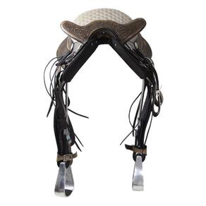 Acessórios 01 - Par de loros acoplados aos para-lamas; 01 - Par de estribos de alumínio; 01 - Par de látegos; 01 - Par de contra látegos; 02 - Barrigueiras sendo uma com 14 e outra com 22 fios e argolas de inox; 01 - Rédea em corda trançada com ponteiras em couro; 01 - Cabeçada em couro com argola de aço inox.