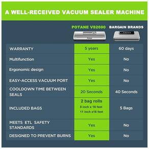MANTENHA OS ALIMENTOS FRESCOS As seladoras a vácuo POTANE VS2690 usam fios de aquecimento de e motor sem escova. Enquanto outras barginbrands usam fios de aquecimento de e motor barato. 8 em 1 pré ajustes fáceis e sistema de controle inteligente 4 modos de operação e quatro modos de vedação a vácuo. Pode sentir e aspirar com precisão de acordo com o tipo de alimentos. DESIGN SUPERIOR INCLINADO O design superior inclinado evita que o suco seja extraído durante a aspiração de alimentos como carne. Também garante que os sacos de selagem a vácuo sejam totalmente utilizados. ETL UL TESTADO E CERTIFICADO O selador a vácuo POTANE é ETL e UL certificado pelo Nationally Recognized Test Laboratories NRTLs para conformidade com os padrões de segurança de produto aplicáveis, SEGURANÇA É NOSSA PRIORIDADE NÚMERO 1 Marca: Não Informado