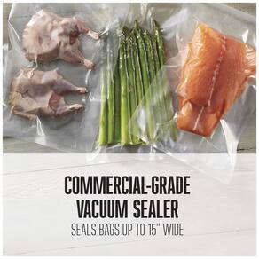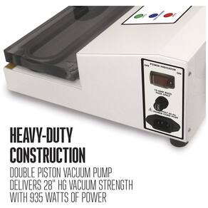 Painel de luz LED com motor refrigerado por ventilador com modo automático para operação com um toque e modo manual. 935 watts 120 volts, 60 Hz. A barra de vedação extra longa com de espessura veda sacos de até . Vácuo rápido e tempo de vedação. A bomba de pistão duplo desenha até Hg de força de vácuo. O selador a vácuo de bancada mantém os alimentos frescos 5 a 6 vezes mais. Modo automático para operação com um toque ou modo manual para um selo personalizado Marca: Não Informado