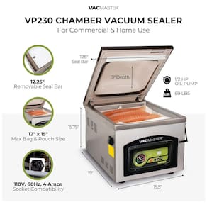 Vácuo de Câmara VACMASTER VP230 O VP230 da VacMaster possui uma série de recursos, incluindo uma barra de vedação de com fio de vedação dupla para proteção extra, partida automática ativada simplesmente fechando a tampa e muitos outros recursos fáceis de usar, tornando esta máquina perfeita para restaurantes, instituições culinárias e outros negócios relacionados a alimentos. Também é uma ótima máquina de nível básico para caçadores, pescadores e outros usuários domésticos que dependem de obter uma ótima vedação para preservar sua caça, captura ou refeição. É fácil de usar e pode até lidar com líquidos sem nenhum problema. O selador a vácuo de câmara VP230 é para VOCÊ Características Arranque automático Serviço pesado,tampa transparente Barra de vedação de com fio de vedação dupla Configurações de tempo ajustáveis Parar e vedar a QUALQUER momento Indicador de pressão de fácil leitura Bomba de óleo rotativa de 1, 2 HP Trava da tampa para fácil zenamento Inclui 60 bolsas de câmara diversas 1 Placa de Enchimento Guia do Usuário Marca: Não Informado
