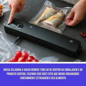 Seladora a vácuo de alimentos doméstica portátil bivolt. Remove o ar, prolongando a vida útil dos alimentos e preservando o sabor.Vendido e entregue por WebContinental