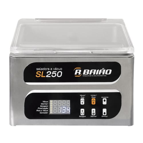 A Seladora a Vácuo SL250 da R. Baião é perfeita para quem busca praticidade e economia, seja em ambientes domésticos ou comerciais. Compacta e moderna, ela se adapta facilmente ao seu espaço e rotina, realizando o vácuo em sacos nylon poli lisos e potes herméticos. Sua função de marinar com ciclo regulável realça o sabor dos alimentos rapidamente, ideal para cozinhas que valorizam eficiência e qualidade. Com estrutura em aço inox 304 e cuba com cantos arredondados, facilita a limpeza e garante durabilidade. O painel digital com botão PARE e classificação IP65 oferece controle seguro e intuitivo do processo. Indicada para uso em comércios e residências, essa seladora prolonga a vida útil dos alimentos, mantém sabor e cor, facilita o transporte e agrega valor aos seus produtos.
