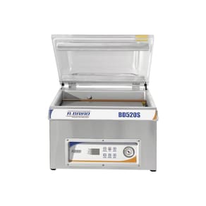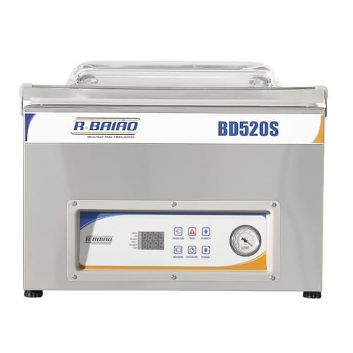 A Seladora a Vácuo de Câmara R. Baião BD520S é ideal para supermercados, açougues, padarias, casas de carnes, buffets e estabelecimentos que exigem qualidade e praticidade no processo de conservação de alimentos. Fabricada em aço inox 304, com tampa em acrílico de 20 mm e barras de selagem acionadas por cilindros com isolação em fibra de vidro, oferece durabilidade e segurança no uso contínuo. Sua cuba interna conta com cantos arredondados que facilitam a higienização e evitam acúmulo de resíduos. Com painel digital IP65 e contador de processos, a operação torna-se ainda mais eficiente. A bomba de vácuo R. Baião de 10m/h garante uma selagem rápida, segura e eficaz, com extração de até 99,8% do ar da embalagem, preservando sabor, cor, qualidade e aumentando a vida útil dos alimentos embalados.