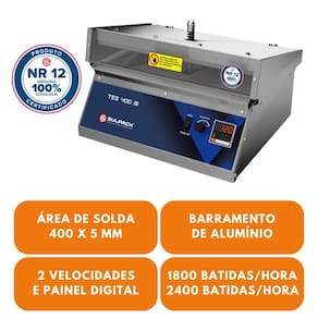 Seladora de solda lisa, construído em aço inox 304 escovado e equipadas com sistema de proteção que evita acidentes do operador, com laudo de NR 12 em conformidade com as normas do Ministério do Trabalho.