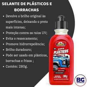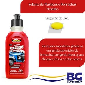 Selante de Plástico e Borrachas 280g Proauto Bem Vindos a nossa Loja Despachamos o mais rápido possível Selante de Plásticos e Borrachas 280g - Proauto -pode ser Utilizado tanto nas áreas externas como internas; -previne o ressecamento; -proporciona o brilho duradouro; -protege contra os raios UV; -promove hidrorrepelência. Modo de Uso: Aplique algumas gotas do produto em uma esponja e espalhe uniformemente sobre a superfície desejada. Ean: 7897520016429