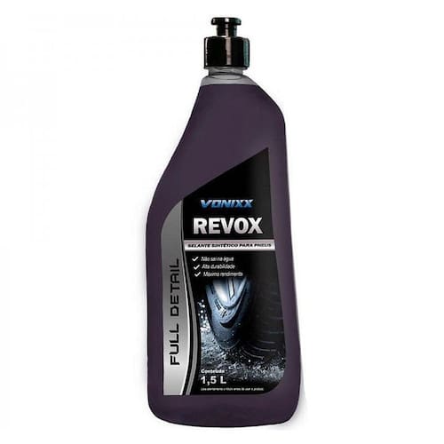 detalhes do selante sintético revox 1,5 litros vonixx: selante sintético para pneus, desenvolvido especialmente para dar brilho e renovar o aspecto promovendo hidrorrepelência a superfície. Revox é um produto ecologicamente correto, livre de solventes, resistente a lama e chuva, deixando com aspecto limpo por mais tempo. Durabilidade de 30 a 45 dias na superfície, já vem pronto para uso. Uso: certifique que os pneus estão limpos, antes de realizar a aplicação. Com o auxilio de um aplicador de espuma, aplique o produto de maneira uniforme. Caso deseje um nível de brilho maior nos pneus realize uma nova aplicação. Conteúdo: 1,5 litros
