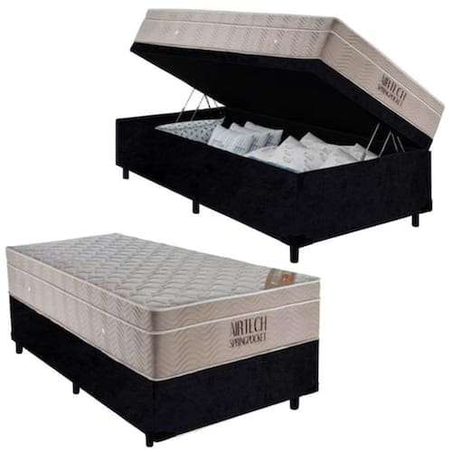 Cama Box Baú Solteiro + Colchão Molas Ensacadas - AirTech Spring (88x188x72) - Ortobom - Preto