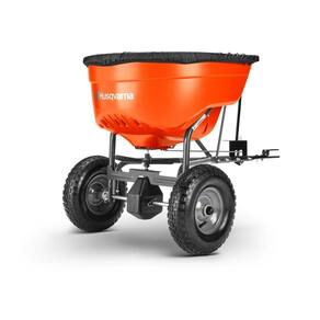 Espalhador com transmissão Tow-behind da marca Husqvarna, com padrão de distribuição de 10' a 12'.