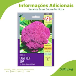 Características * Variedade: Couve-Flor Roxa Super * Nome científico: Brassica oleracea var. botrytis * Formato: Cabeça compacta e firme * Coloração: Roxa intensa * Ciclo: Anual * Exposição solar: Sol pleno ou meia-sombra (mínimo 3 horas de sol por dia) * Germinação: Aproximadamente 5 a 10 dias * Transplante: Quando as mudas atingirem 10 cm de altura * Espaçamento mínimo: 100 x 50 cm * Colheita: Cerca de 120 dias após o plantio * Quantidade por embalagem: 2,50 g * Quantidade aproximada de sementes por grama: 290 * Sementes livres de transgênicos e agrotóxicos * Renascem: RS-05567/2019