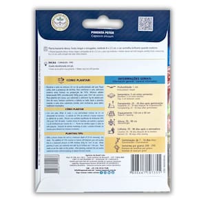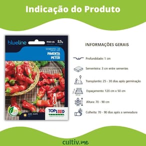 Características: * Nome Científico: Capsicum Annuum * Germinação: 7 a 14 dias * Profundidade da Semeadura: 1 cm * Espaçamento: 120 cm x 50 cm * Altura da Planta: 70 a 90 cm * Transplante: 25 a 30 dias após a germinação * Colheita: 70 a 90 dias após a semeadura * Sementes por Grama: 200 a 250 * Pureza: 99% * Germinação: 82% * Peso Líquido: 2,5 g * Clima Indicado: Quente e Temperado * Renascem: SP-17443/2019
