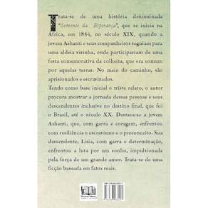 Trata-se de uma história denominada “Semente da Esperança”, que se inicia na África, em 1854, no século XIX, quando a jovem Ashanti e seus companheiros seguiam para uma aldeia vizinha, onde participariam de uma festa comemorativa da colheita, que era comum por aquelas terras. No meio do caminho, são aprisionados e escravizados. Tendo como base inicial o triste relato, o autor procura mostrar a jornada dessas pessoas e seus descendentes inclusive no destino final, que foi o Brasil, até o século XX. Destaca-se a jovem Ashanti, que, com garra e coragem, enfrentou com resiliência o escravismo e o preconceito. Sua descendente, Lísia, com garra e determinação, enfrentou a luta por um sonho, impulsionada pela força de um grande amor. Trata-se de uma ficção baseada em fatos reais. Marca: Não Informado