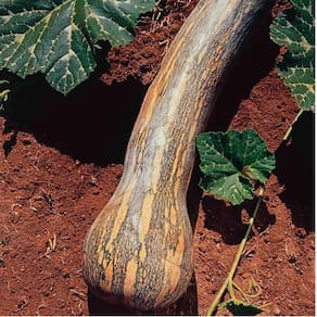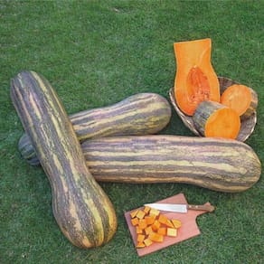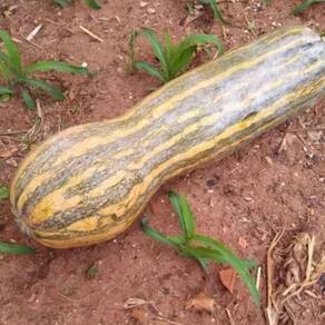 Descrição * Nome cientifico: Cucurbita moschata. * Planta rasteira, polpa alaranjada, firme e doce. * Comprimento aproximado da fruta de 100 cm.
