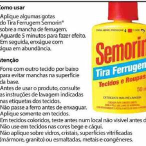 COMO USAR Aplique algumas gotas do Tira Ferrugem Semorin® sobre a mancha de ferrugem. Aguarde 5 minutos para fazer efeito. Em seguida, enxágue com água em abundância.