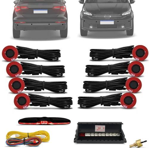 Especificações Técnicas: Detecção de obstáculo a partir de de 2 metros Temperatura De Funcionamento: -30+80 °C Operações: Monitor On/Off, Alarme, Mudo Sistema Universal Para Qualquer Carro Sensores: 4 Dianteiros e 4 Traseiros Painel Digital De Fácil Leitura Sensores Com Ajuste Automático Detecção Precisa De Obstáculos Capsulas Blindadas De 16.5mm Alarme Sonoro De Proximidade Faixa de tensão 10.5 a 16v DC Frequência Ultrasônica: 80KHz 8 Sensores De Aproximação Corrente 20mA a 200mA Display Slim 2X1 Modelo Discreto Na Cor Preto Voltagem 12V