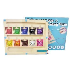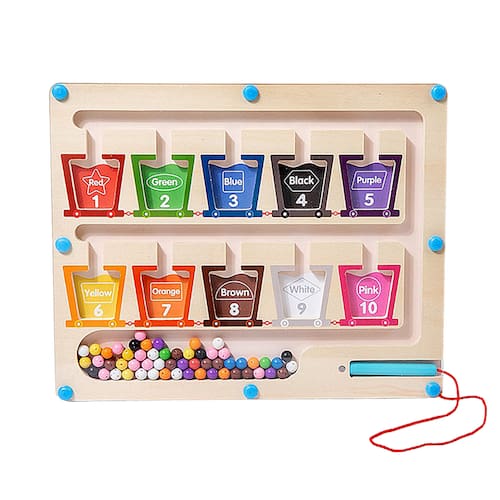 Desenvolva habilidades importantes de forma divertida com o SEPARA AS CORES! Este brinquedo educativo apresenta uma placa de madeira com trilhos magnéticos que guiam bolinhas coloridas para seus respectivos compartimentos numerados.
