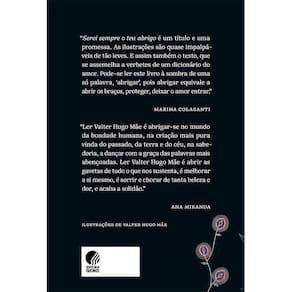 Nas páginas de Serei sempre o teu abrigo, Valter Hugo Mãe nos mostra a sabedoria e a coragem que há no sentimento, e essas palavras são acompanhadas das ilustrações do próprio autor, coloridas sobre fundo escuro, fauna e flora de um ambiente pouco investigado, como é o território dos afetos.