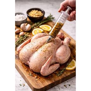 A seringa injetora de temperos 60ml é ideal para deixar carnes muito mais suculentas e saborosas. Perfeita para frango, carnes bovinas, suínas e aves em geral, permite a aplicação direta do tempero no interior da carne, garantindo melhor absorção e sabor uniforme.
