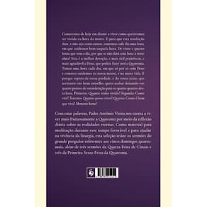 Comecemos de hoje em diante a viver como quereremos ter vivido na hora da morte. E para que esta resolução dure, e não seja como outras, tomemos cada dia uma hora, em que cuidemos bem naquela hora. De vinte e quatro horas que tem o dia, por que se não dará uma hora à triste alma? Esta é a melhor devoção, e mais útil penitência, e mais agradável a Deus, que podeis fazer nesta Quaresma. Tomar uma hora cada dia, em que só por só com Deus e conosco cuidemos na nossa morte, e na nossa vida. E porque espero da vossa piedade, e do vosso juízo, que aceitareis este bom conselho, quero acabar deixando-vos quatro pontos de consideração para os quatro quartos desta hora. Primeiro: Quanto tenho vivido? Segundo: Como vivi? Terceiro: Quanto posso viver? Quarto: Como é bem que viva? Memento homo! Com estas palavras, Padre Antônio Vieira nos exorta a viver mais frutuosamente a Quaresma por meio da reflexão diária sobre as realidades eternas. Como material para meditação durante esse tempo favorável e para ajudar na vivência da liturgia, esta seleção reúne os sermões do grande pregador referentes aos cinco domingos quaresmais, além de três sermões da Quarta-Feira de Cinzas e três da Primeira Sexta-Feira da Quaresma. Ean: 9788584912421