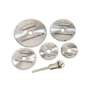 Haterial: HSS Rotação Máxima: 20.000 rpm nunca ultrapassar Para sua Segurança: Utilize sempre óculos e luvas de proteção Conteúdo da embalagem: 5 discos + 1 mandril