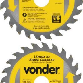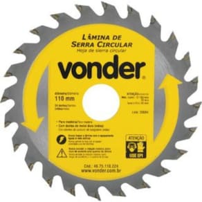 Serra Circular Videa 110x20x24D Vonder 1 Lâmina de serra circular. Indicada para cortar madeiras. Nunca exceder a rotação máxima rpm - risco de acidente e/ou queima da lâmina. Não cortar madeiras impregnadas com massa ou cimento. Para cortes em MDF, a vida útil da serra e o nível de qualidade do acabamento serão reduzidos. A Vonder disponibiliza em seu mix, serras apropriadas para cortes em MDF.Corpo em aço carbono com dentes de metal duro/vídea que proporcionam maior vida útil Marca: Vonder Diâmetro da lâmina de serra circular:4.3/8 - 110 mmNúmero de dentes da lâmina de serra circular:24 dentesEspessura de corte da lâmina de serra circular:2,6 mmEspessura do corpo da lâmina de serra circular:1,5 mmDiâmetro do furo da lâmina de serra circular:20 mmRotação máxima da serra circular rpm :12.100/minVelocidade periférica máx. :70 m/sTamanho da bucha de redução:De 20 mm para 16 mmImagem meramente ilustrativa
